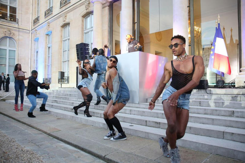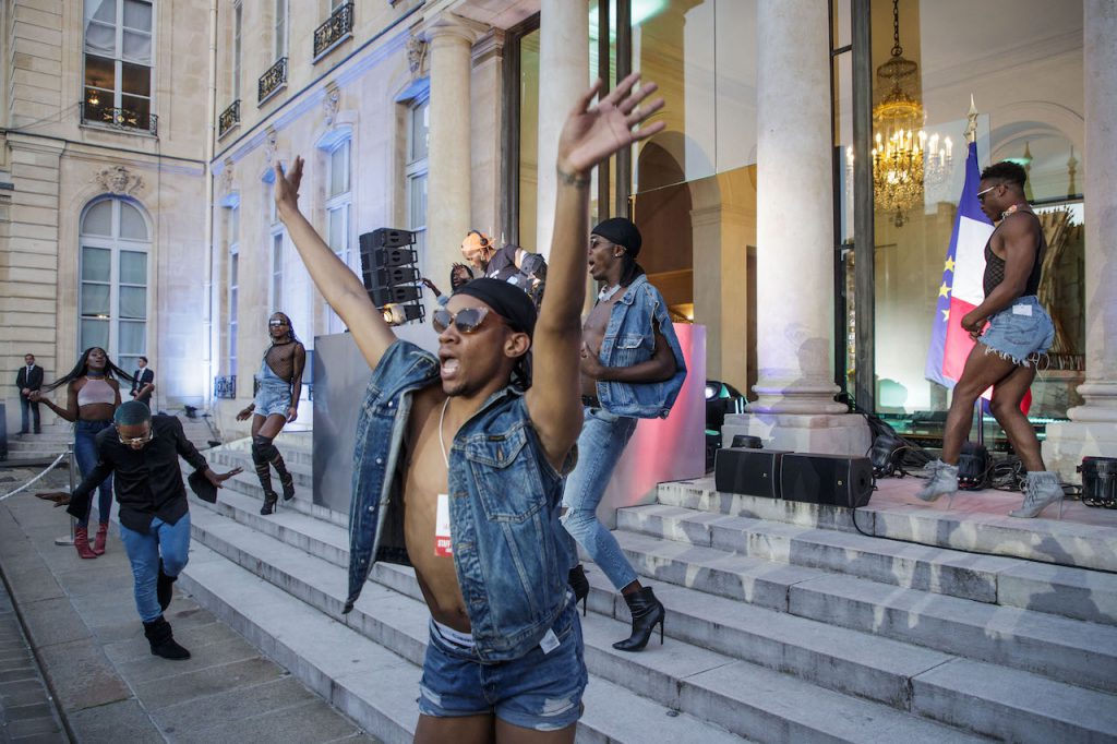 Invité au déjeuner des porte-drapeaux et représentants des associations patriotiques, un militaire s'amuse à faire le poirier sur le perron de l’Élysée.
