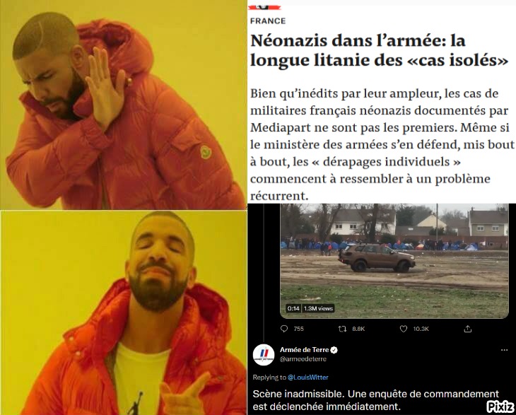 | Je suis accro ![]() Inscrit le: 25/1/2021 Envois: 713 Karma: 439 |   Re: Un véhicule militaire s’embourbe après des drifts dev...  5  C'est l'armée "de terre" effectivement |