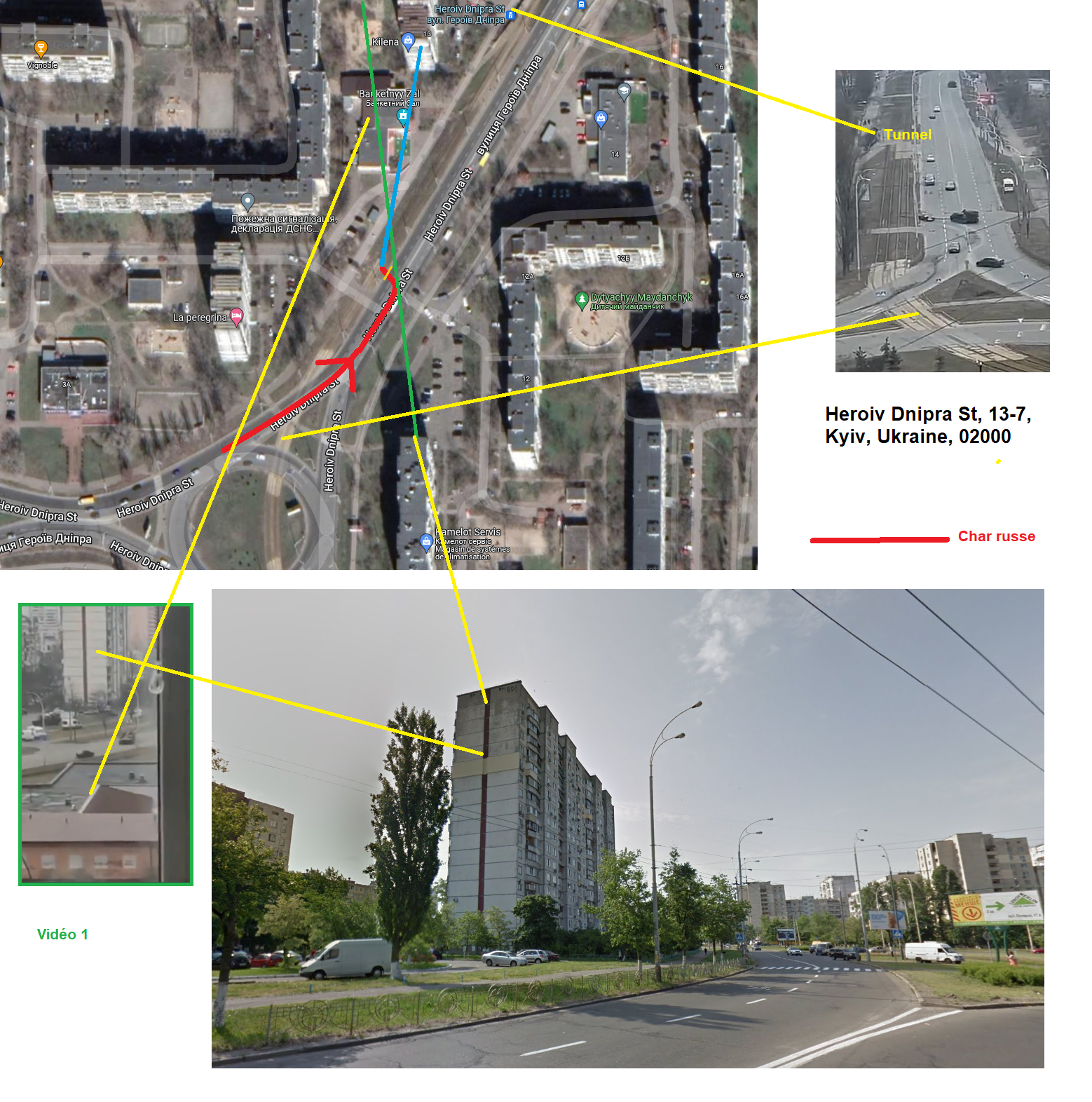 qui se trouve à ~2km au sud de l'écrasement de la voiture. Qui pourrait donner si c'était éventuellement le cas une genèse. Les chars sur les vidéos ne semblent pas avoir le "Z" de reconnaissance des chars russes.