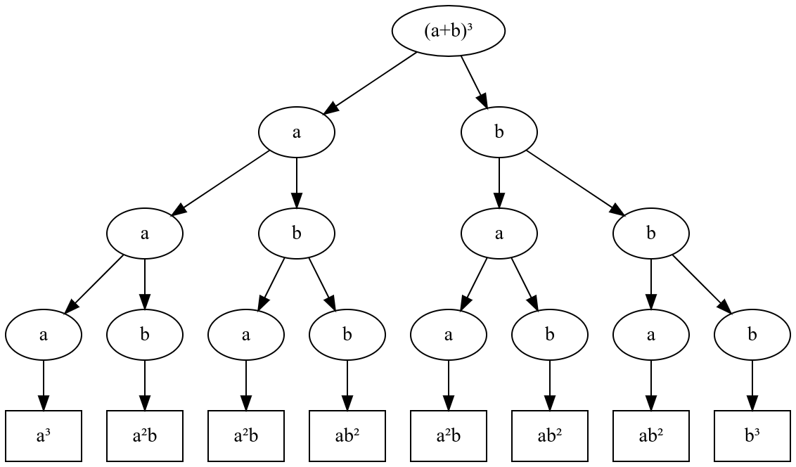 Avec un dessin, on voit même mieux pourquoi on peut calculer les coefficient en utilisant le nombre de combinaisons. (0 parmi 3, 1 parmi 3, 2 parmi 3, 3 parmi 3)