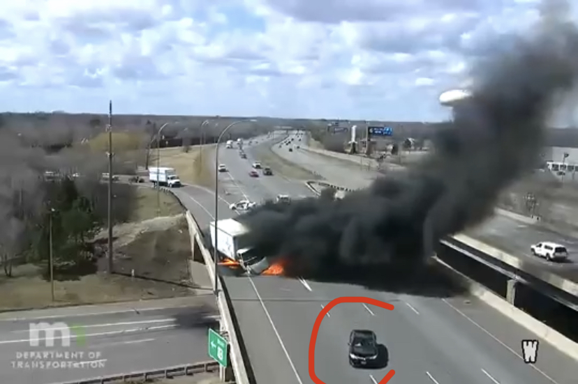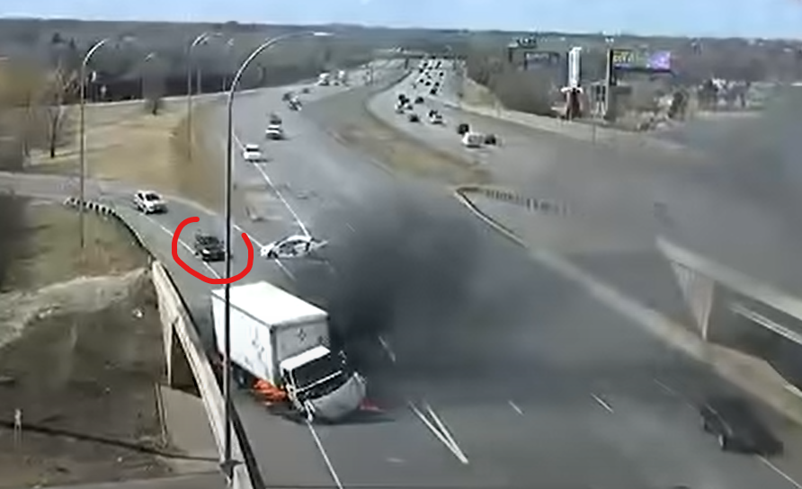 @Djizeusse On ne peut pas lui en vouloir, c'est instinctif, puis on ne sait pas trop ce qu'il fait, car il est vite hors champ. A mon avis, c'est celui qu'on voit arriver en bas de la vidéo qui porte secours au conducteur, ca correspond totalement, car au moment de l'accident, il n'y a qu'en arrivant derrière le camion que tu sais ce qu'il se passe, les voitures devant , mis à part conduire en regardant derrière soit, ne peuvent pas voir l'accident. Donc l'hypothése est que la voiture noire voit l'accident, se dit qu'en pleine sortie de bretelle et aussi proche du brasier c'est pas la meilleure position, passe à coté du camion, met du temps de passer pour observer si le conducteur va bien, se rabat sur la file de secours , se gare et le conducteur apparait en bas en courant.