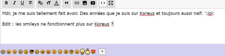 Mdr, je me suis tellement fait avoir. Des années que je suis sur Koreus et toujours aussi naïf. ![]() Edit : les smileys ne fonctionnent plus sur Koreus ? ![]()