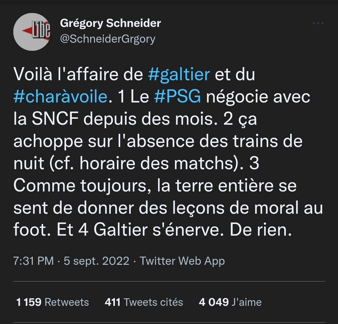 @ Kratos2077 Ce n'est pas n'importe quelle forme d'humour, c'est du sarcasme, donc une moquerie tournant en dérision une situation. Le sarcasme est délibérément provocateur et malveillant. Ici, le message c'est clairement "Vous avez vraiment cru qu'on va prendre un moyen de transport aussi nul que le train comme n'importe quel quidam". Donc que ce soit de l'humour n'empêche pas de s'offusquer de cette réaction   Citation : Cets facile de privatiser un tgv, pas de soucis, mais à la gare, imaginons les 11 bonhommes avec leur petite valise sur le quai et tout le staff avec et les tables de massage et le reste... quand on voit les bleus remonter les Champs Elysées, vise le monde... J'imagine très bien la scène... et ? Les valises seront déjà installé dans leur wagon ainsi que les tables de massages, ils auront qu'à venir en voiture de service (avec les mêmes qu'ils prennent pour se rendre jusqu'à leur jet privé...). N'essaye pas de chercher des excuses rationnelles en fait, il n'y en a pas. D'ailleurs c'est pour ça que Galtier répond de manière sarcastique : car il n'a aucun argument solide pour refuser le train, donc il n'a pas d'autres choix que de répondre par : "non mais attendez, on est qui nous ? On est pas n'importe quel péquenaud, on est important donc on prend l'avion"