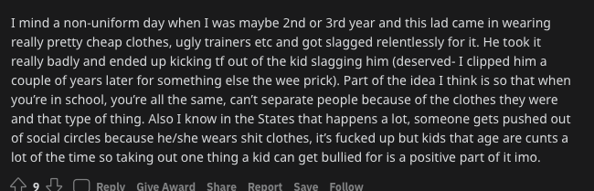 Je suis peut-être un vieux con aujourd'hui mais clairement je n'ai aucun souvenir positif lié au fait de pouvoir s'habiller comme on veut dans l'école publique en France, j'ai d'avantage souvenir d'un grand nombre de moqueries/jugement et que de choses négatives dont j'ai été également impacté comme par exemple les marques omniprésentes, vraiment c'est d'une toxicité sans nom, ça fait des ravages chez les enfants... alors après d'accord les enfants sont des enfants et ils vont sans doute toujours trouver matière à exprimer leurs bas instincts sur d'autres sujets... |