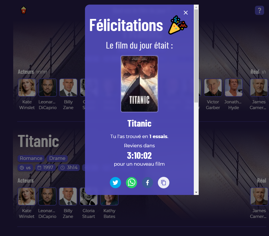 @Adelaide1624 @1jour1film Bonsoir, Merci beaucoup pour ce jeu, c'est super sympa. Petite question : comment connaître la réponse quand on n'a pas réussi à trouver le film ? Merci !