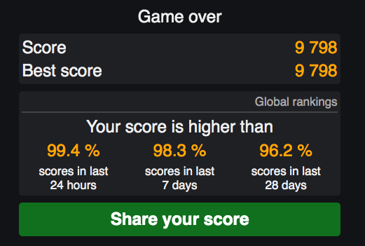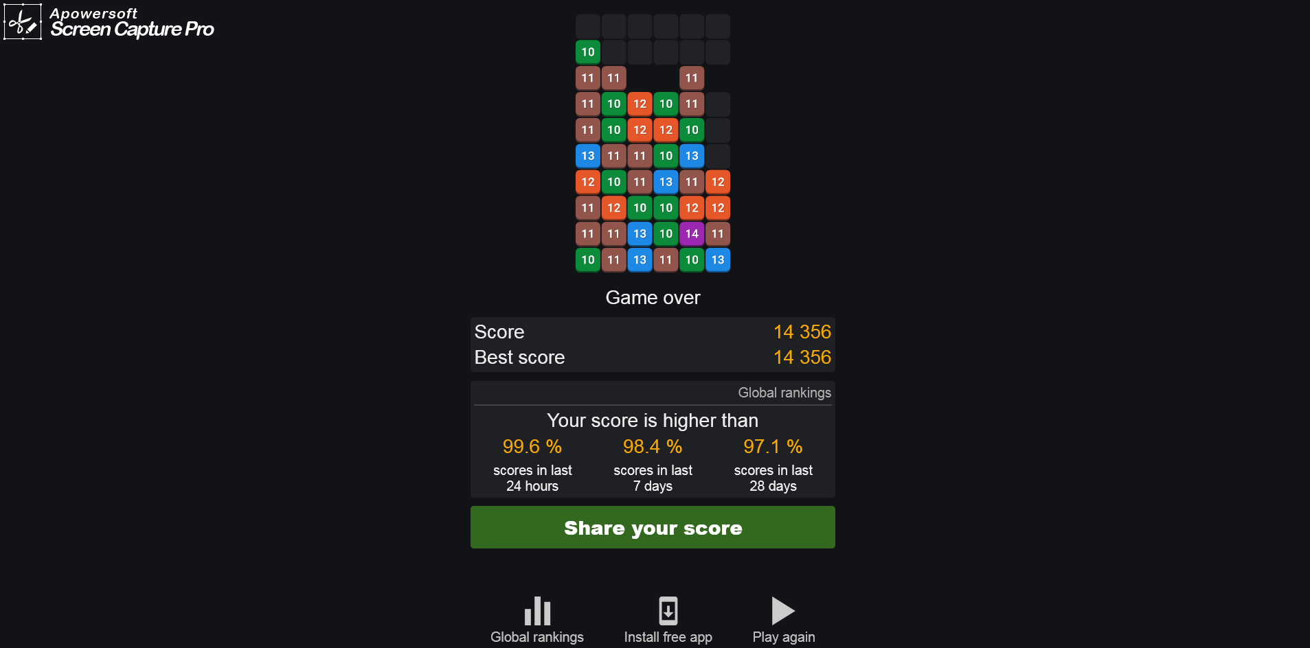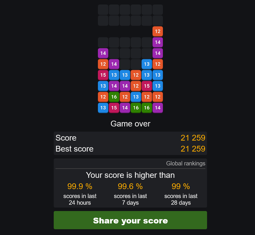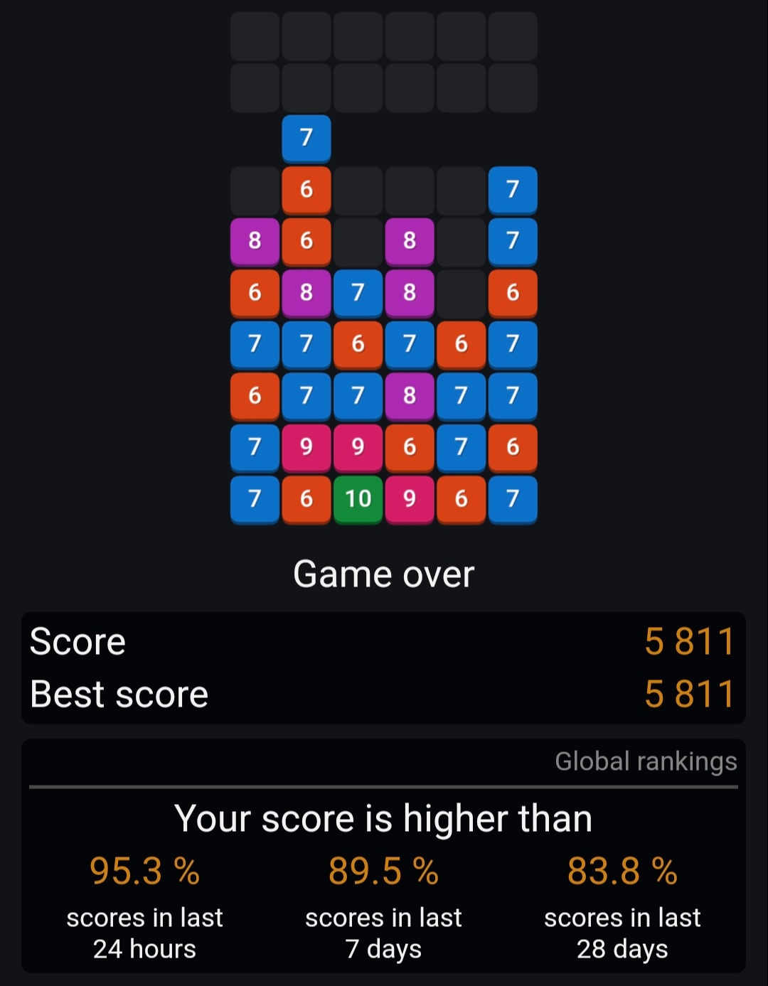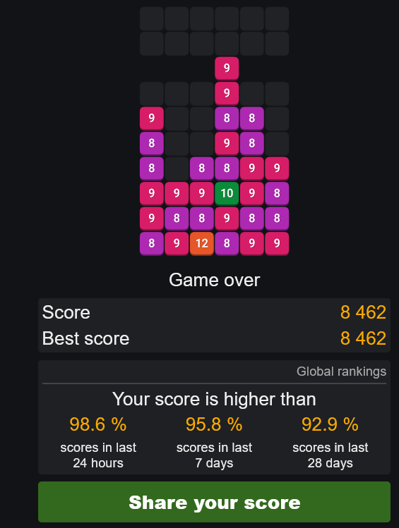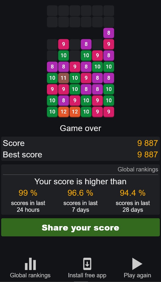 Ce jeux ne s’arrête jamais... ca manque un peu de musique mais c'est sympa. Just scored 10 103 in Mergetin. That's higher than 99.2 % scores in last 24 hours. Check it out! https://mergetin.com/scores/230106/e0t7W