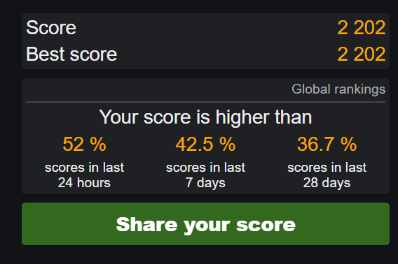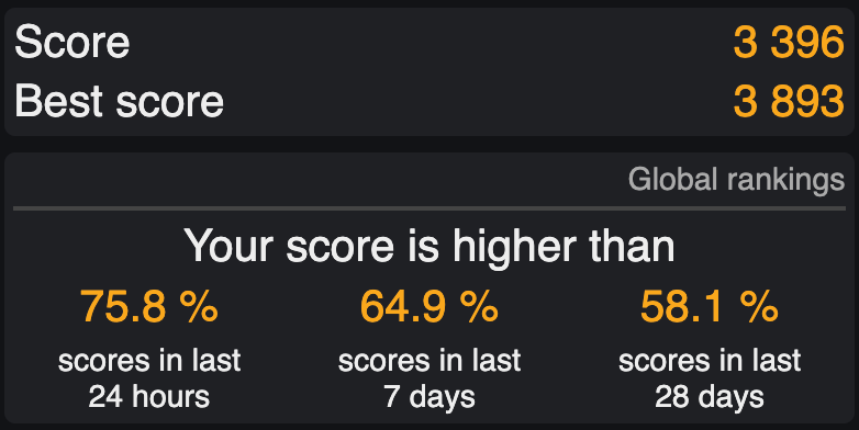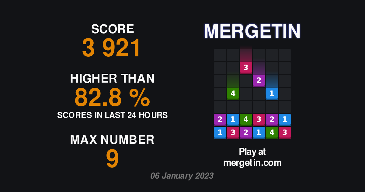 Sympa comme petit jeu. Just scored 3 265 in Mergetin. That's higher than 76.9 % scores in last 24 hours. Check it out! https://mergetin.com/scores/230106/e8N3r