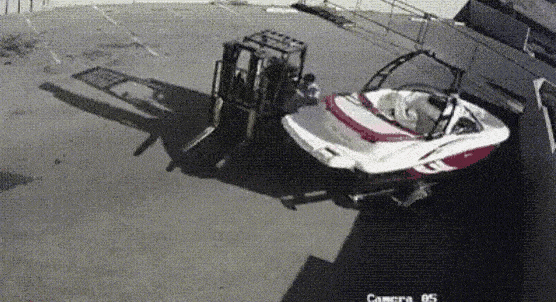 @Uatuu Un chariot elevateur doit pouvoir descendre sa fourche bien plus bas que les roues. Ce gros chariot en photo sortait le bateau de l'eau. Je pense qu'il allait d'abord éloigner son bateau, descendre la fourche, ramener le bateau dessus et l'attacher, puis relever le tout. Il y a peut-etre meme un mecanisme qui permet de debrayer la fourche et la descendre a la main quand on est devant le chariot?