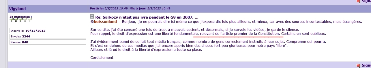 Un autre charlot ici alors. Moi je vois un lambda qui se targue d'années d'études (non justifiées) pour appuyer son argument, ou plutôt son non-argument puisque ces soi-disant années sont l'argument ! MDR. Et pour enfoncer un clou tout mou, le "jusqu'à la CEDH" m' a bien fait exploser de rire !!! Et je rigole encore plus quand un soi-disant spécialiste en droit écrit ça : [img][/img] Pourquoi je rigole ? Parce l'article premier de la Constitution ne parle absolument pas de la liberté d'expression, mais de la République et des notions d'égalités !! MDR. Un spécialiste en droit qui cite faussement la Constitution..... Rhooo. Et en plus, cerise sur le gâteau, la Constitution ne dit pas que "le droit d'expression est une liberté fondamentale", mais : "La loi garantit les expressions pluralistes des opinions et la participation équitable des partis et groupements politiques à la vie démocratique de la Nation." Et c'est l'article 4 !