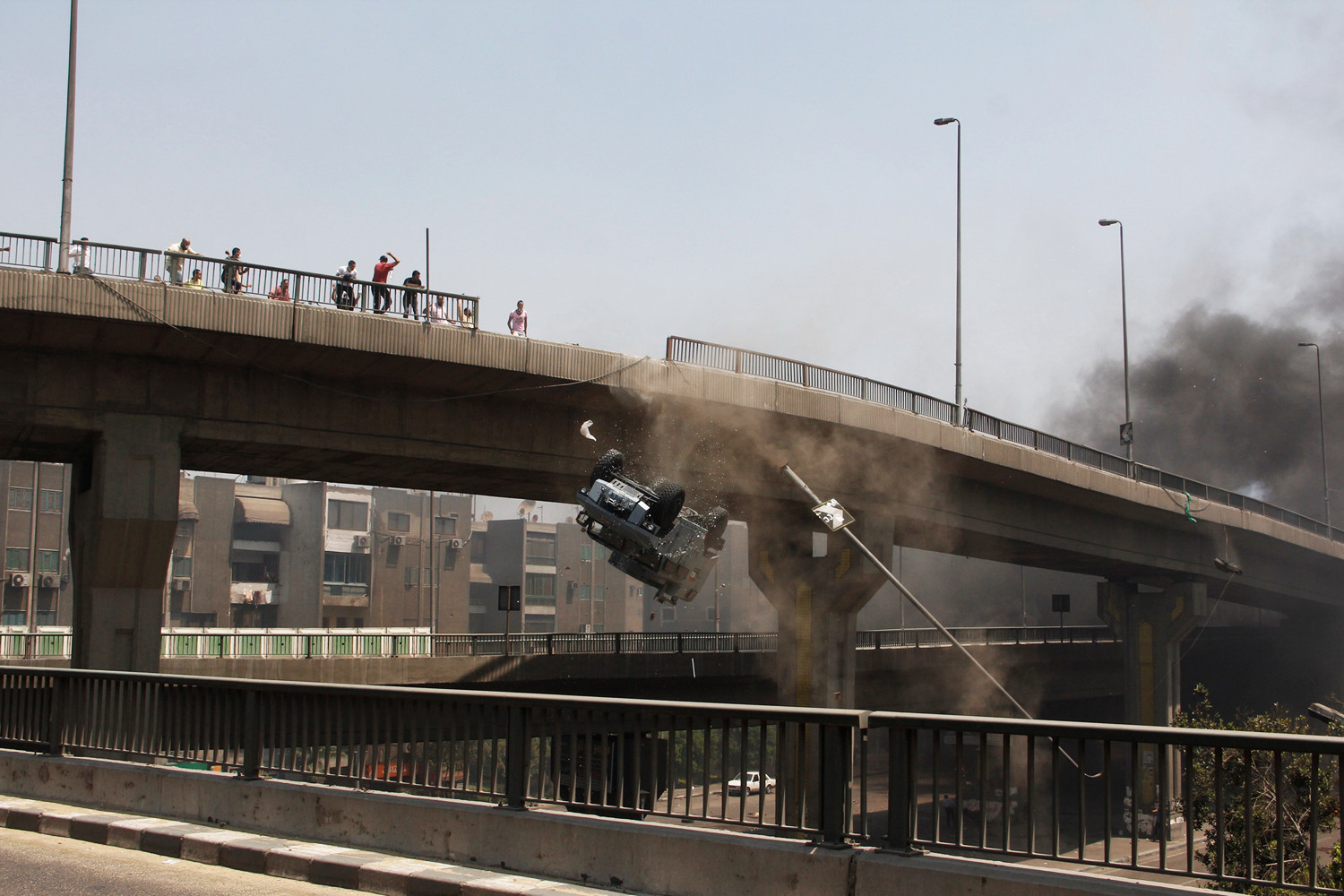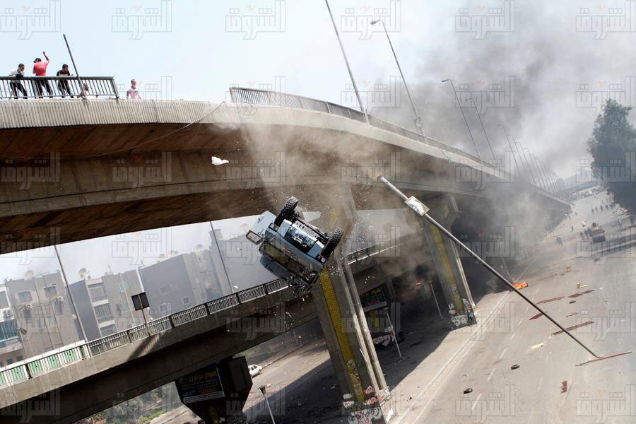 Pendant une manifestation au Caire en Egypte, une voiture blindée de la police chute d'un pont en voulant fuir des manifestants. Le blindé a fait une marche arrière et est passée par-dessus le pont faisant une chute de plusieurs mètres.