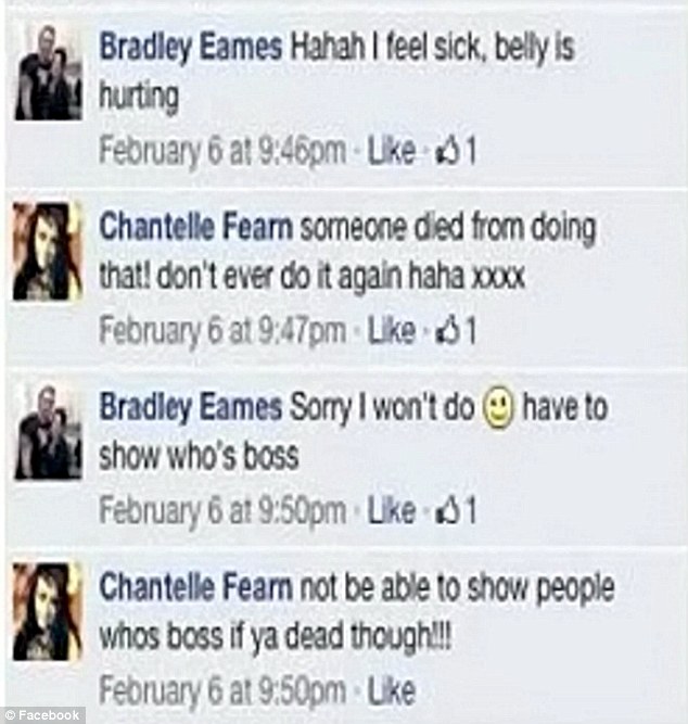 La conversation sur FB renforce vraiment le côté dramatique de la chose, surtout quand une amie lui prévient que des personnes sont déjà mortes comme ça... J'avais déjà lu l'article sur DM aujourd'hui et ça m'étonne qu'à moitié que ça apparaisse ici. Ça me rappelle une vidéo où un adolescent Russe buvait une bouteille de vodka cul sec avant d'aller en classe... puis on voyait ensuite le résultat un peu plus tard, le gamin effondré par terre et du vomi partout sur sa table et le sol... et c'était bien avant l'émergence de ces paris... voire même de FB d'ailleurs.
