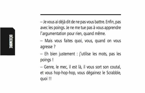 - Genre le mec il est là, il vous sort son coutal et vous hop hop hop, vous dégainez le Scrabble quoi !