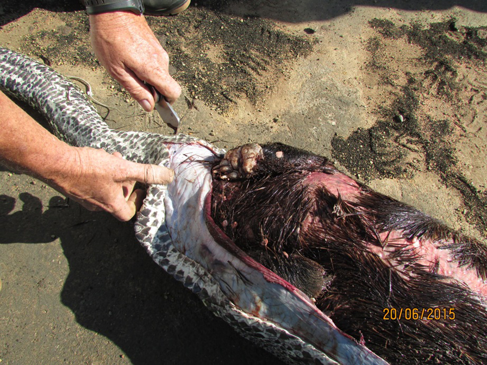Ouf, j'ai cru qu'ils avaient tué et ouvert le serpent pour sauver la bête dedans, heureusement que c'est précisé (un peu tard) qu'il était déjà mort.