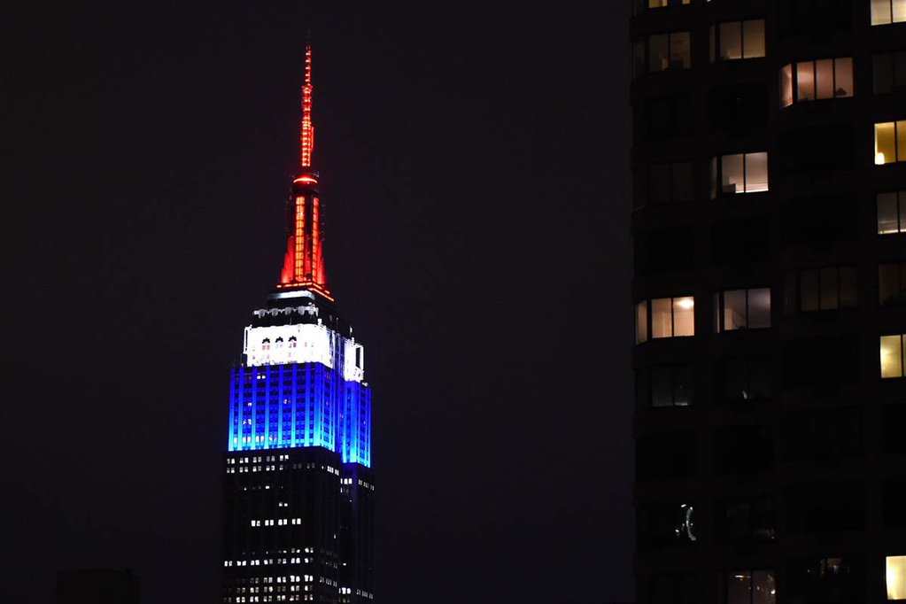Je sais pas pour l'Empire State hier soir mais il arrive quelque fois qu'elle se met en bleu blanc rouge mais ce n'est pas pour la France.