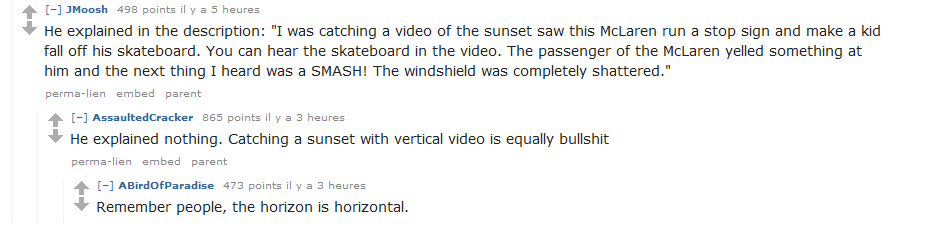 Le gars explique "Je prenais une vidéo d'un couché de soleil quand j'ai vu une McLaren griller un stop et faire tomber un enfant de son skate. Le passager à crié qqchose puis le gosse à cassé le pare brise"