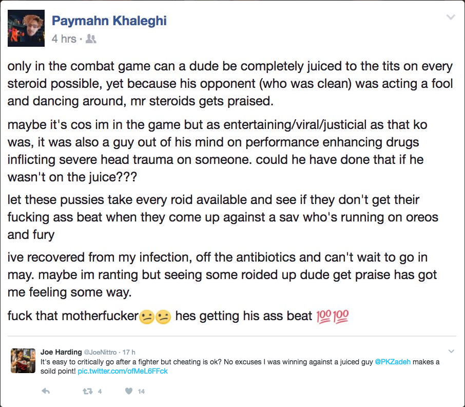 ce dont se plaint le mec au sol qui est ko dans le tweet posté par vdd, c'est justement que son adversaire français qu'il dit être sous l'influence de drogues aurait dû aussi s'en rendre compte... et que s'il n'avait pas été sous stéroïdes, il ne l'aurait pas ainsi attaqué au sol...