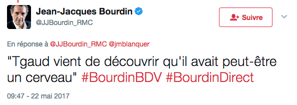 @Tgaud Bravo Tgaud et merci... Merci d'être aussi prévisible, de retourner à tes amours, lad hominem, la dénonciation, le rideau de fumée, le détournement d'attention, la pleurnicherie et le martyrologue, l'insulte, le manichéisme simpliste, la mauvaise foi patente, etc., toute cette méthode qu'inlassablement tu emploies, tout ce qui fait ta gloire et ta réussite : dame, dans des circonstances extrêmement favorable, réussir une éclatante victoire à..34%, c'est énorme !