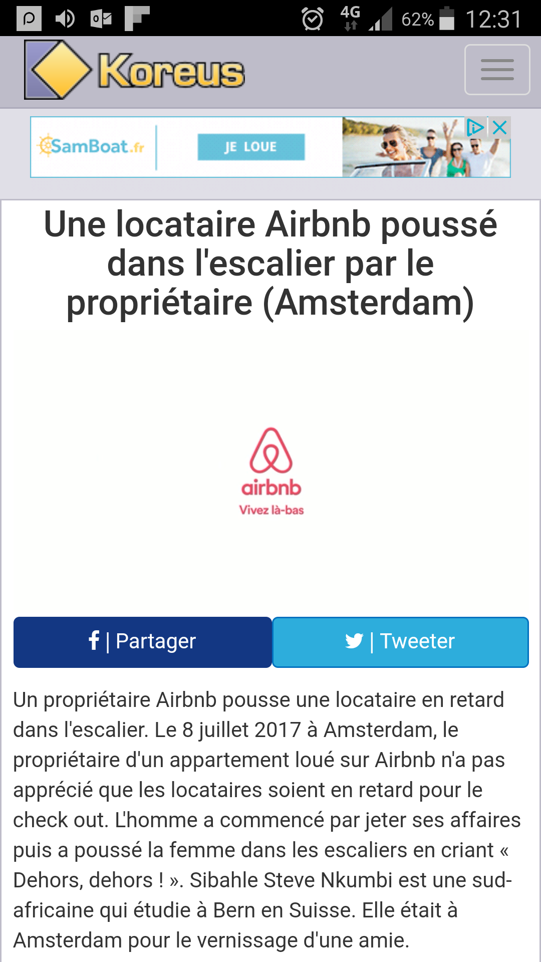 A Amsterdam, une femme sud-africaine en vacance avait loué un appartement via Airbnb. Le propriétaire n'a pas apprécié qu'elle soit en retard pour le check out et l'a poussé dans l'escalier.