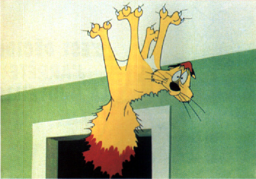 Je pense que si le chat a eu peur, c'est plus par les cris de la gonzesse que par le rat.