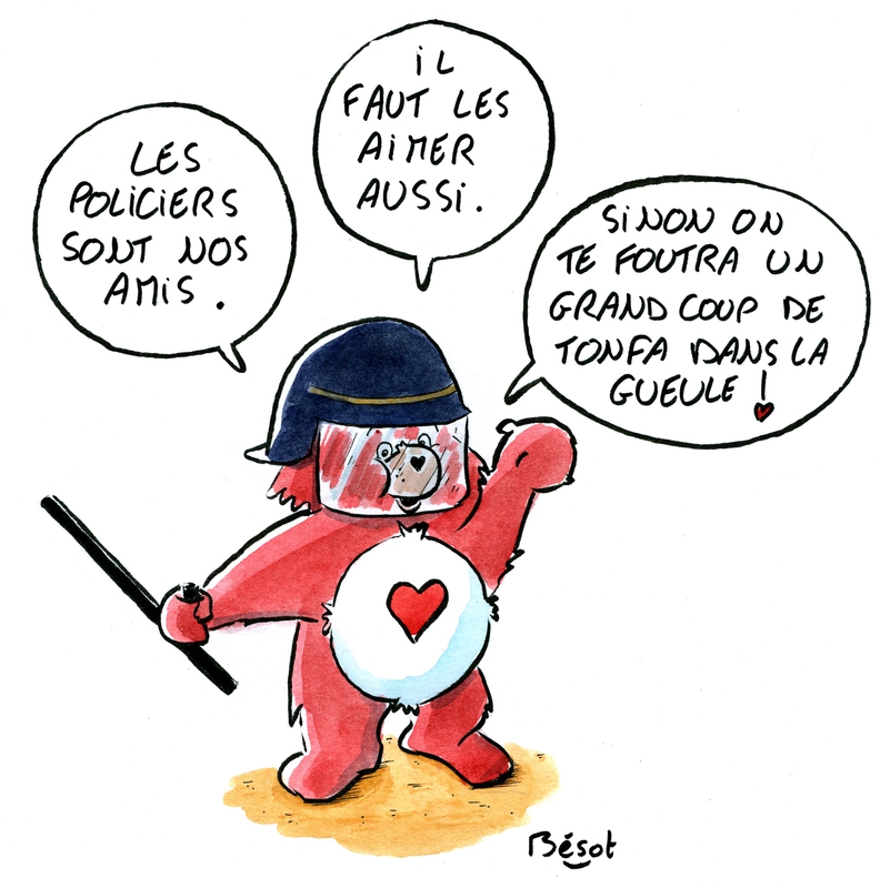 Et au passage, si tu passais tes dernières heures de travail à te prendre des boules de pétanque, des molotovs, des bombes agricoles dans la gueule, tu serais toi aussi sur les dents à réagir aux provocations de Mme la bobo. Rien n'excuse la violence.
