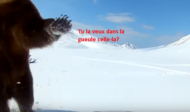 Un animal oublie vite, au bout d'un moment l'ours fuit sans trop savoir si c'est le campement ou les moto-neiges ou s'il doit se défendre (la preuve). Donc au contraire, c'est contre-productif de le courser pendant plusieurs minutes.