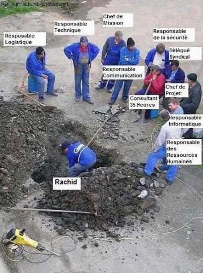 Ca me rappelle une blague : Ce sont 2 gars des Espaces Verts qui bossent dans un jardin public. Le premier fait un trou puis le second le rebouche. Un gars passe et leur dit "Mais vous faîtes quoi là ?" L'employé municipal lui répond "Normalement on est 3 mais notre collègue qui met les arbustes dans le trou est malade aujourd'hui..."