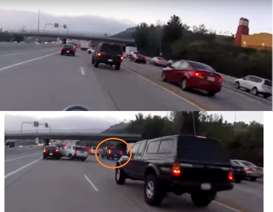 Le motard roule un peu trop vite, mais il est sur une carpool lane, qui est justement faite pour éviter les congestions et donc dans lesquelles on roule un peu plus vite. On ne peut théoriquement s'insérer sur ce genre de voies qu'a des portions de routes spécifiques et indiqués. Dans tous les cas le SUV blanc n'a pas a se déporter à cet endroit là sur les roues ou sur le toit.