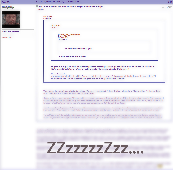 Je ne fais que passer. Le problème c'est qu'on finit par ne plus savoir qui a cité qui, il y a trop à scroller!