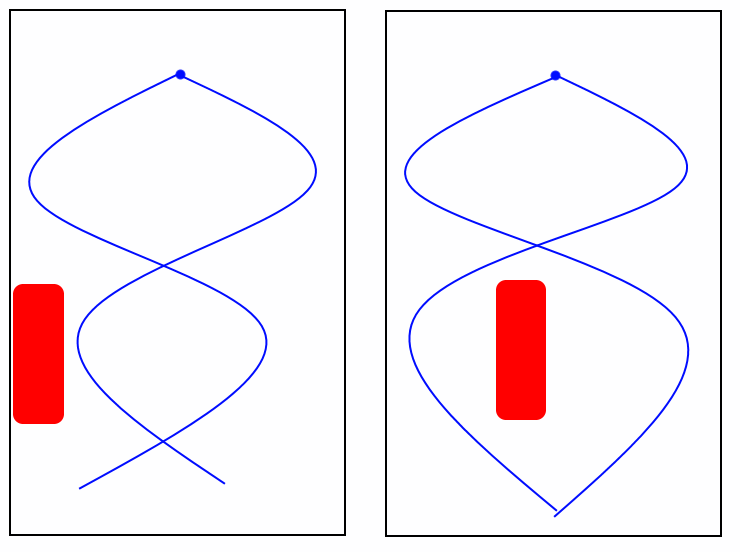 Sur le schéma ci-dessous, on voit bien que dans le cas de figure ou le groupe (en rouge) est stationné sur le côté, il est directement vulnérable en cas de faute de carre sur un virage. Dans le cas de figure de droite, la faute de carre éventuelle éloigne l'usager du groupe. En plus de ça, le groupe est bien visible de tous (rappelons que physiologiquement, plus on va vite et plus le champ de vision se restreint à ce qui est devant nous).