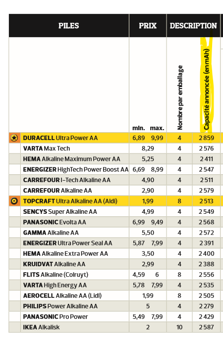 J'ai l'impression qu'il y a le même ratio entre Duracell et Varta concernant le test de "durée" et le test de "rapidité". => Globalement, les deux doivent avoir la même capacité.