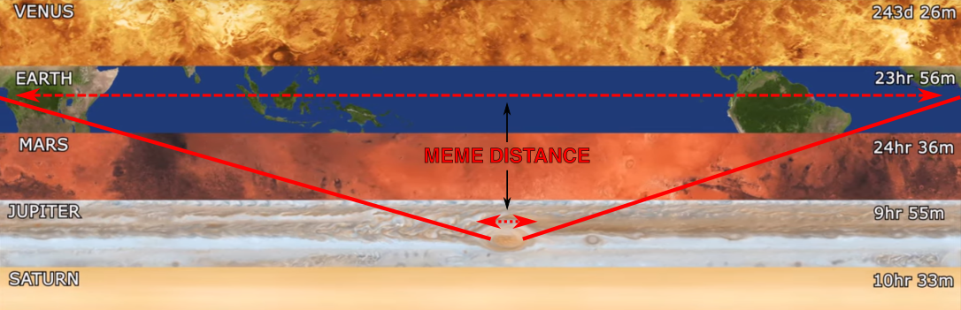 Mouais, ça ne veut pas dire grand chose au final... La vidéo a l'air d'être calculée sur la vitesse de rotation brute, sauf que le diamètre de ces différentes planètes est très différent. Or, la vidéo illustre cette rotation avec la visu externe de la couche superficielle, donc elle devrait logiquement prendre en compte le déplacement linéaire et tenir compte du diamètre de l'objet. Au final, la vitesse de défilement linéaire de la bande de Jupiter devrait aller beaucoup plus vite que 2,4 fois celle de la Terre puisque le rayon de Jupiter est pratiquement 11 fois plus grand que celui de la Terre.