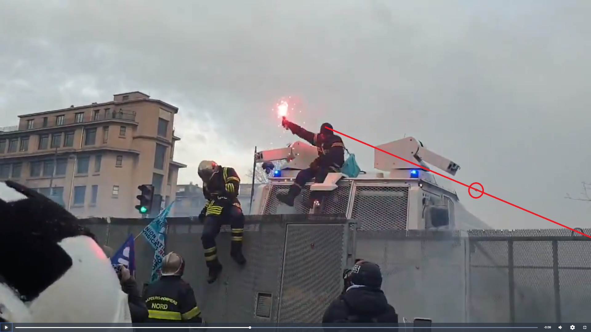 Voir un pompier, brandissant un fumigène, grimpé sur un véhicule de police puis se prendre un coup de LBD...