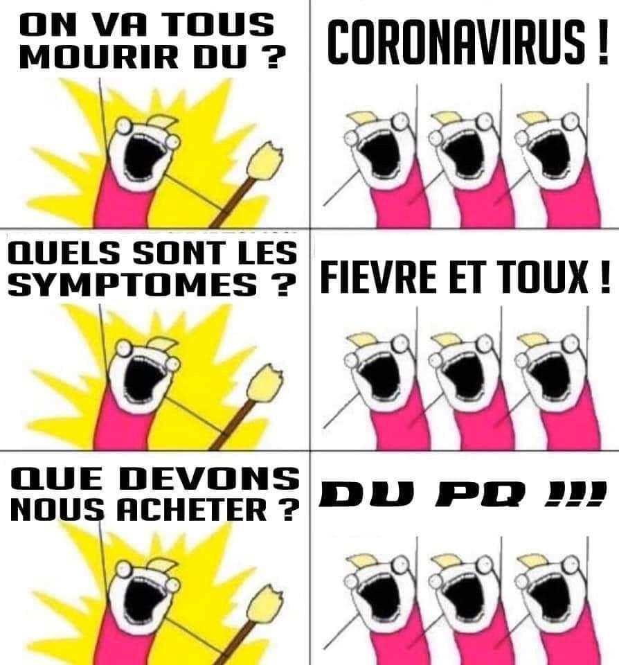 Le problème c'est surtout qu'on ne sait pas comment vont continuer à réagir les gens. Sur les 3 dernières semaines, je suis passé 5 fois dans un supermarché. Il n'y avait du PQ disponible que 2 fois. Sachant qu'il nous reste environ 2/3 semaines de PQ à la maison, j'ai pris l'un des derniers paquets de 9 rouleaux qui restait vendredi matin pour éviter de devoir passer plusieurs heures à chercher du PQ dans plusieurs magasins si jamais tout est vide au moment où j'en aurai vraiment besoin. Alors oui j'ai participé à l’hystérie collective, j'ai essayé de ne pas exagérer mais j'y ai participé quand même. Sauf que des gens qui manquent de produits de première nécessité, on commence à en avoir autour de nous, et ils sont obligés de faire plusieurs magasins et d'attendre pour en trouver. Ça a commencé par des imbéciles, et maintenant c'est une démarche de protection contre ces imbéciles qui engendre ce problème. |