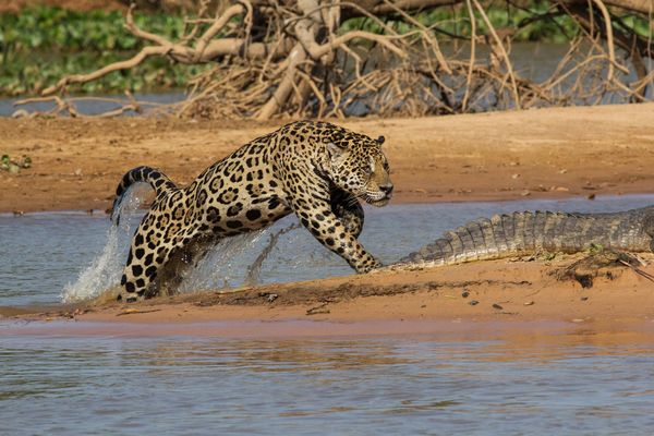 " Dans le pantanal au Brésil, un touriste a filmé un jaguar en train d'attaquer un caïman (crocodile) par surprise "