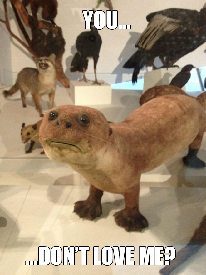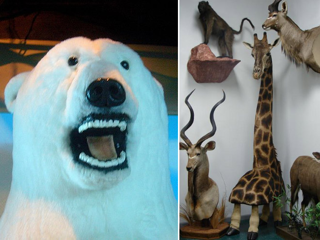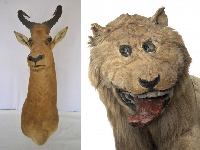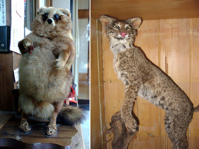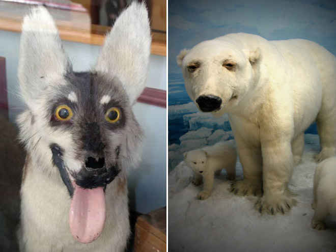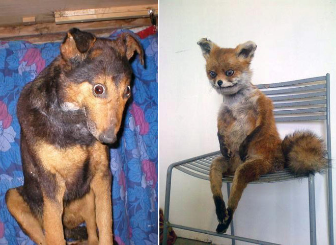 Belle sélection, certains diaporamas sur le même thème incluent des images absolument normales et des naturalisations de bonne qualité, mais totalement incomprises des internautes. Bon exemple avec le renard aplati un peu plus haut, qui n'est pas un animal naturalisé, mais une mise en peau, c'est à dire conservation de la peau en vue d'une taxidermie future ou d'un stockage en réserve muséale, mais non destinée à l'exposition.