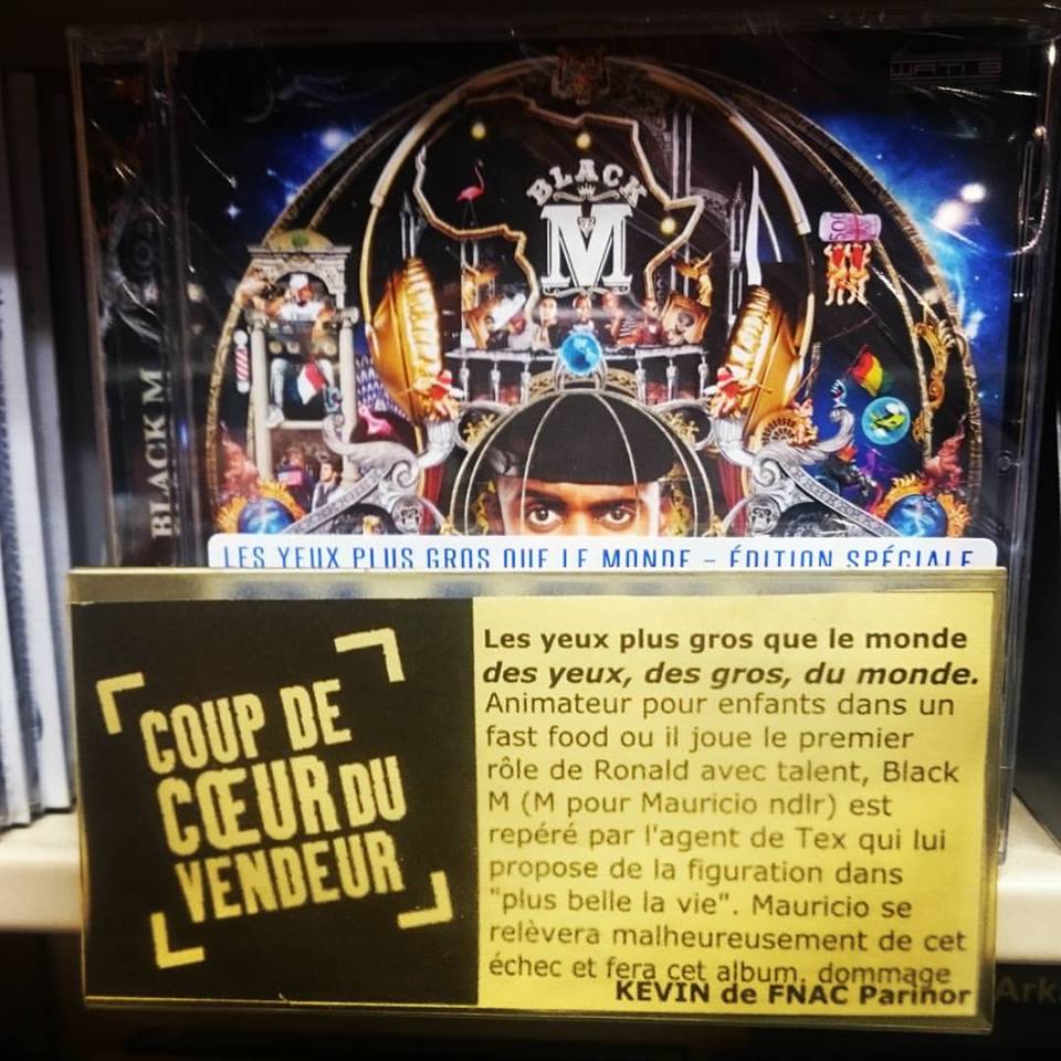 Kévin travaille au rayon disques et DVD du magasin et s’amuse beaucoup avec les étiquettes « coup de cœur du vendeur ». Il réalise des critiques musicales amusantes sur les artistes. Ansi on apprend que le dernier album de Chantal Goya a été au Texas dans le couloir de la mort, que Black M était animateur pour enfants dans un fast-food et que Maitre Gims est le Dany Brillant du rap français.