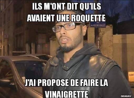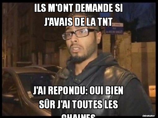 Le mec est quand même mal barré si c'est vrai : http://www.lefigaro.fr/actualite-france/2015/11/19/01016-20151119ARTFIG00310-saint-denis-le-temoignage-qui-laissait-presager-de-nouveaux-attentats.php"L'homme qui a hébergé le commando de terroristes à Saint-Denis aurait confié, dimanche, à un jeune du quartier l'imminence d'attaques contre des «enseignes américaines» de la ville." Du coup après quand on le pense coupable, on se dit qu'il a du mal à assumer ses mensonges avec ses détournements du regards à la fin de chacune de ses phrases ^^
