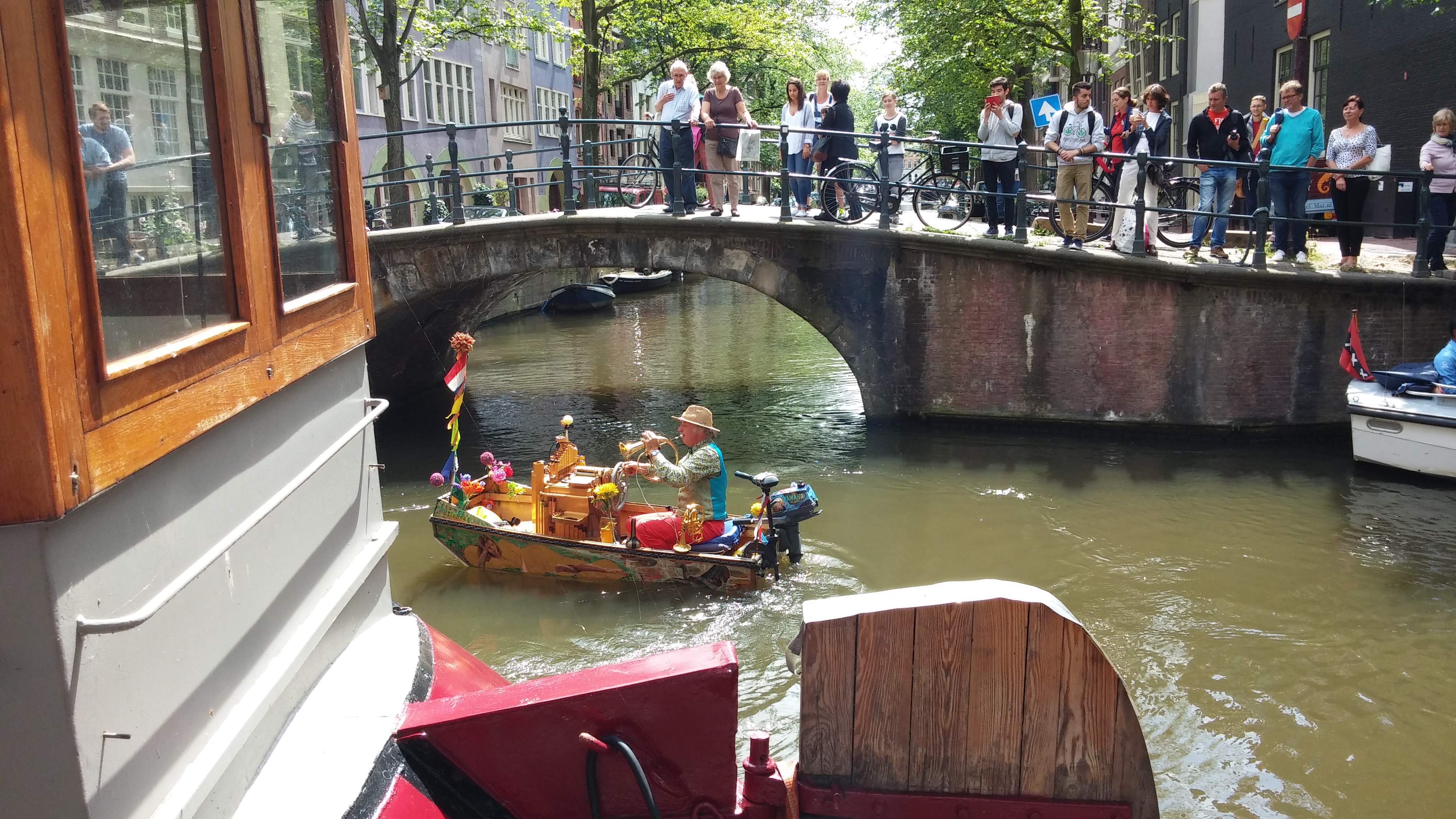 Un homme sur un bateau joue de la trompette et de l'orgue de Barbarie en étant accompagné par les cloches de la vieille église d'Amsterdam, aux Pays-Bas.
