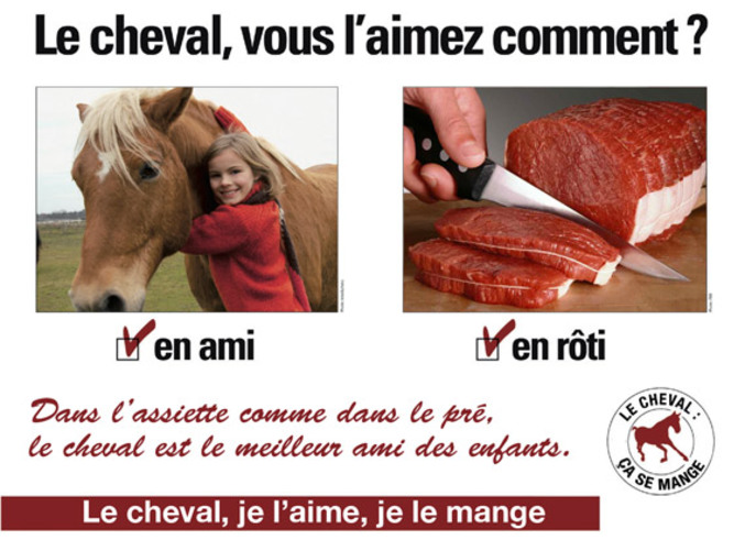 en tout cas, ma grand-mère en mange quand même malgré qu'elle aime les chevaux de leur vivant, car c'est assez maigre en graisse et que ce n'est pas mauvais. Un choix que je respecte. En revanche se soucier de la condition de vie animal serait bien mieux. être vegan, ne leur rendra pas la vie meilleur ça c'est clair... il y a des gens qui aiment les animaux et qui ne savent pas du tout s'en occuper.