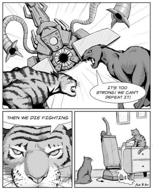 Ce robot est similaire aux candidats du second tour. Il est tout beau, tout propre, il a l'air neuf... Il suscite l'intérêt chez pas mal de gens. Mais dès qu'on le voit de trop près, dès qu'on perçoit ce qu'il est vraiment, on s'enfuit en courant ! Tu aurais pu filer la métaphore jusqu'au bout et dire que les anti-Macron sont comme ces chats qui s'enfuient sans raison, qui ont peur de ce qu'ils ne connaissent pas, juste parce que c'est nouveau.