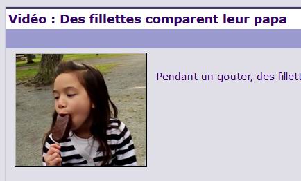 Et vous ne trouvez pas ça glauque, un vendeur de glace qui filme des gamines ? "Mon papa il est comme le vendeur de glace, sauf que c'est dans la cave qu'il me filme et que ce n'est pas une glace qu'il me donne !" rooh c'est dégeulasse je m'en excuse vraiment @ alfosynchro au moins je suis sur que ça ne ta pas choqué avant de me faire lyncher je vais faire ce que je sais faire de mieu  Bip Bip et désolé à tout ceux que ma mauvaise blague à choquée