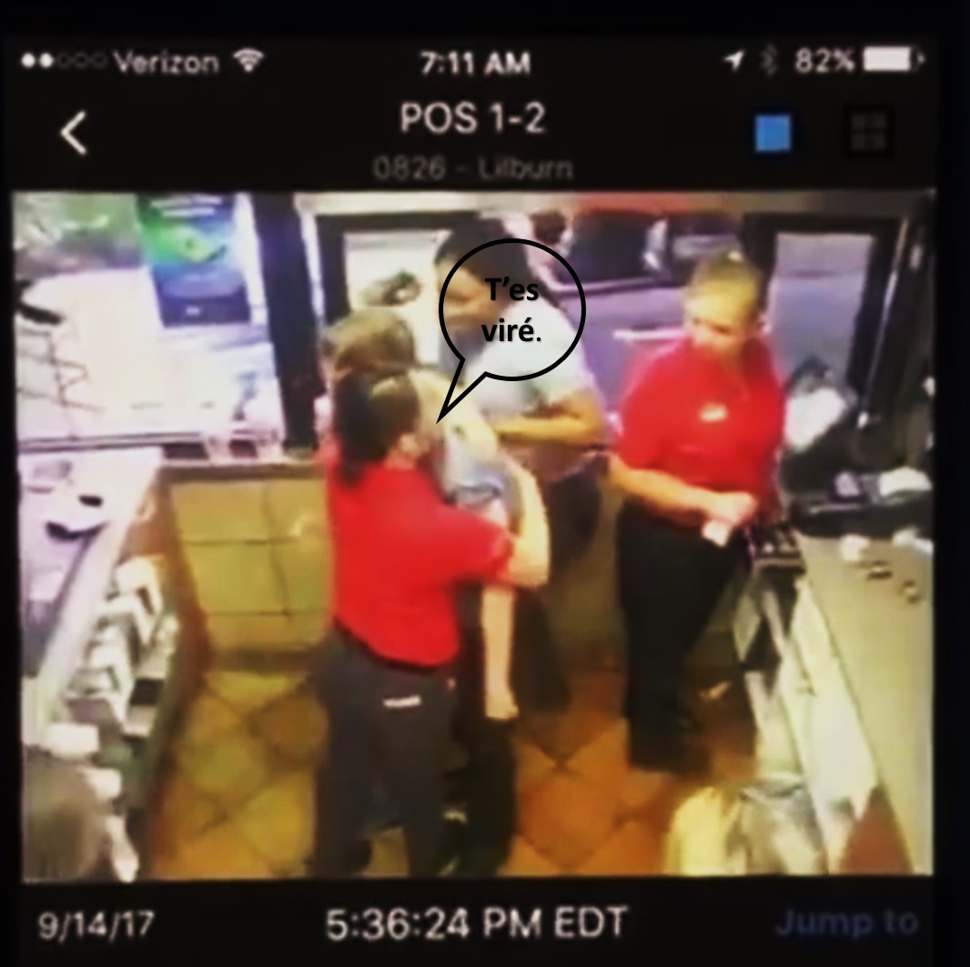dans un fast food... on dirait bien que le mec est déjà au bout de ça vie, le fait qu'il s'arrête, n'ai aucune réaction à par mettre les mains sur ses yeux ET le fait qu'une employé le réconforte direct en dit long... vive les conditions de travail et les institution crée pour les respecter: L O L