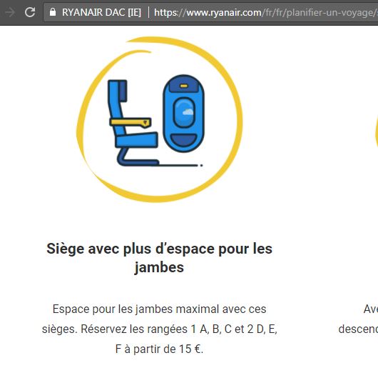 @ Ours_Jigsaw Du haut de mon 1.90m je chéris ces places depuis toujours moi aussi... Je n'ai pas lu le détail des rangées concernées tu as raison... J'ai pris des raccourcis: https://www.quechoisir.org/actualite-ryanair-et-maintenant-l-enregistrement-n1873/Citation : Ainsi, sur certains de ses vols, Air France applique désormais un supplément de 50 euros aux passagers qui souhaitent s'asseoir près des issues de secours afin de bénéficier de davantage d'espace pour leurs jambes.