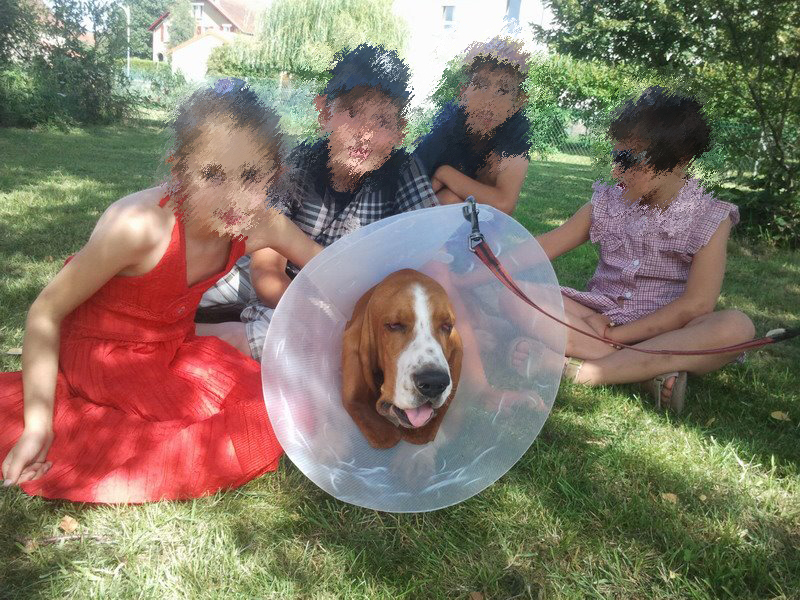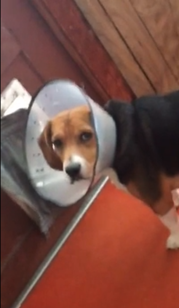 Re: Un chien avec une collerette lance un regard dramatiq...