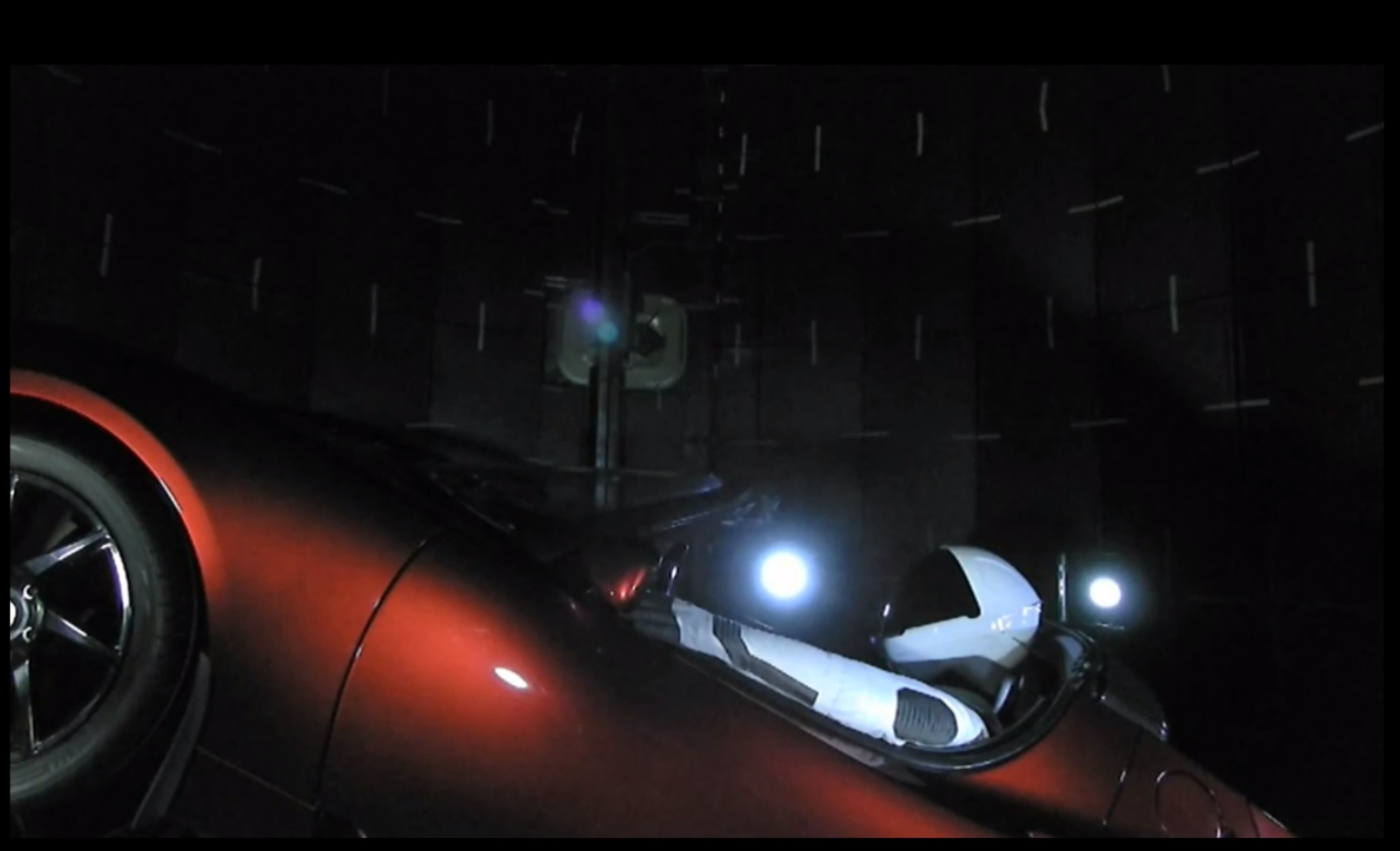 @soren95 au décollage la voiture se trouve dans le "gland" de la fusée (oui ça me fait penser à un zob). la voiture est quant à elle fixée à un propulseur pour lui permettre de contrôler sa trajectoire et d’acquérir un peu plus de poussée afin d'atteindre son orbite finale. tu peux voir derrière la voiture ci dessous l'armature sur laquelle est fixée la caméra de ta prise de vue, et sur les bords les 2 partie du "gland" faisant office de bouclier pour la sortie de l'atmosphère et qui se détachent et retombent sur terre après la sortie de l'atmosphère.