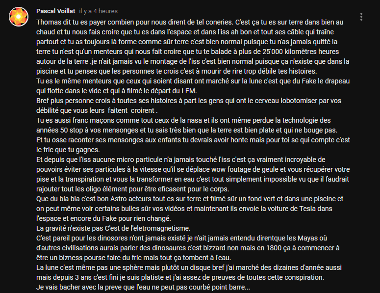 Je connaissais les platistes de mon cul mais là y a quand même un gars qui remet en cause l'intelligence de Pesquet et le traitant d'idiot et de menteur alors qu'il a juste un cursus de dingue et bac +8. Le pire c'est que le gars qui prétend tout ça, n'a aucun diplômes.