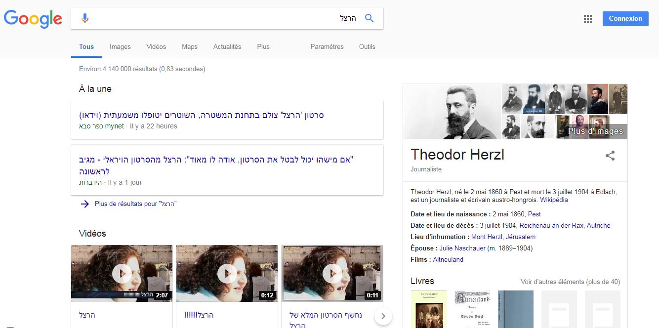 La video a fait un buzz de dingue en Israel la semaine derniere et cela a suffi a l'algorithme de Google pour recaler Theodore Herzl, fondateur du mouvement sioniste, a la deuxieme position