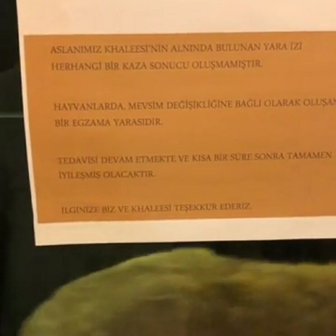 aslanımız Khaleesi'nin alnında bulunan yara izi herhangi bir kaza sonucu oluşmamıştır. hayvanlarda mevsim değişikliğine bağlı olarak oluşan bir egzama yarasıdır. tedavisi devam etmekte ve kısa bir süre sonra tamamen iyileşmiş olacaktır. ilginize biz ve khaleesi teşekkür ederiz.