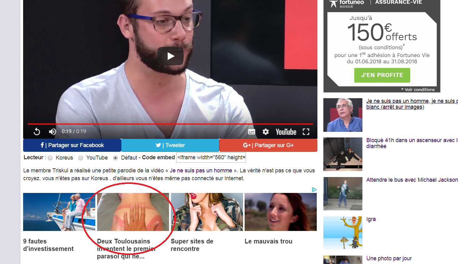 Rien à voir avec cette vidéo, désolé. Mais Je me demande simplement comment fonctionne l’algorithme de choix des pubs de koreus. Sur cette copie d'écran, on me propose de cliquer sur une image bien alléchante qui envoi vers la vidéo du parasol des Toulousains (les vrais koreusiens se souviennent). Sauf que cette image n'a rien à voir avec la vidéo du parasol (c'est une image que j'avais mis en commentaire...).
