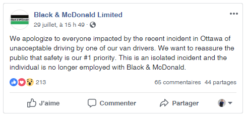 We apologize to everyone impacted by the recent incident in Ottawa of unacceptable driving by one of our van drivers. We want to reassure the public that safety is our #1 priority. This is an isolated incident and the individual is no longer employed with Black & McDonald."